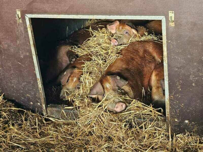 Unsere Schweine (Duroc x Pietrain) halten wir, sofern das Wetter es zulässt, in kleinen Gruppen in Outdoorhütten mit großzügigem Auslauf.